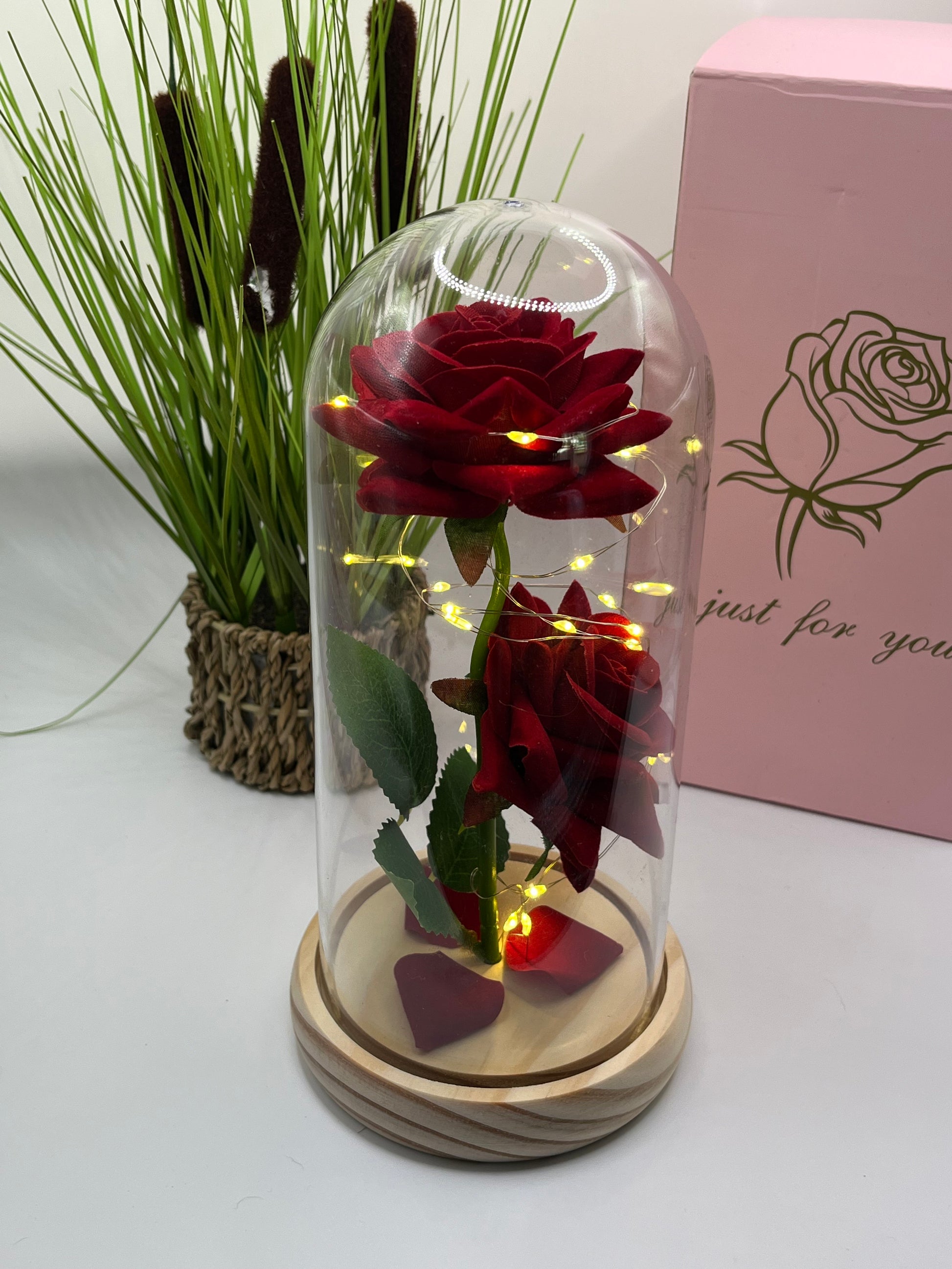 Celebra Sant Jordi con esta delicada cápsula en forma de cilindro, que encierra dos rosas eternas envueltas en cálidas luces de tonos amarillo y naranja. Su diseño combina la magia de un detalle clásico con un toque moderno lleno de emoción. Ideal para regalar a alguien especial o decorar tu rincón favorito con un símbolo de amor duradero.